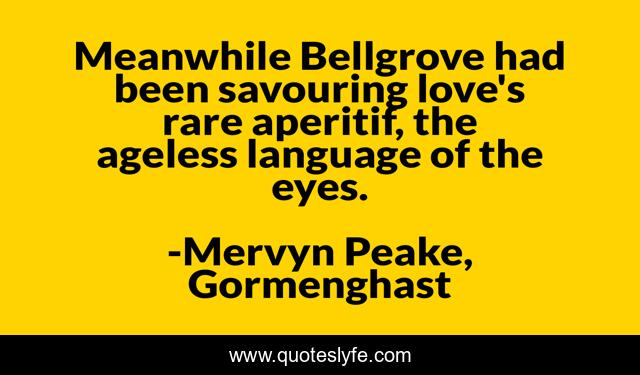 This page presents the quote "Meanwhile Bellgrove had been savouring love's rare aperitif, the ageless language of the eyes.". Author of this quote is Mervyn Peake, Gormenghast. This quote is about eyes, love, affection,.