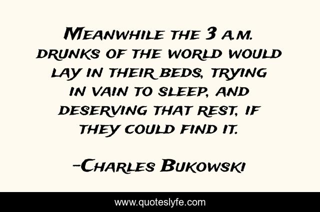 This page presents the quote "Meanwhile the 3 a.m. drunks of the world would lay in their beds, trying in vain to sleep, and deserving that rest, if they could find it.". Author of this quote is Charles Bukowski. This quote is about long-distance-drunk, alcohol,.