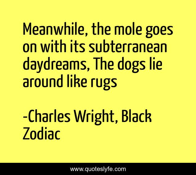 This page presents the quote "Meanwhile, the mole goes on with its subterranean daydreams, The dogs lie around like rugs". Author of this quote is Charles Wright, Black Zodiac. .