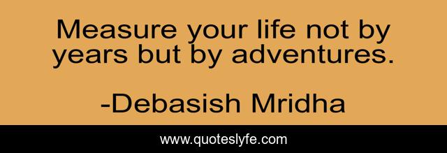 This page presents the quote "Measure your life not by years but by adventures.". Author of this quote is Debasish Mridha. This quote is about life, measure-you-life, philosophy, debasish-mridha, quotes, inspirational, enthusiasm, debasish-mridha-m-d, life-adventures,.