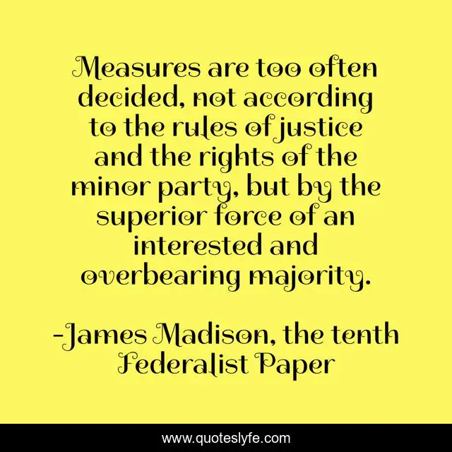 This page presents the quote "Measures are too often decided, not according to the rules of justice and the rights of the minor party, but by the superior force of an interested and overbearing majority.". Author of this quote is James Madison, the tenth Federalist Paper. .