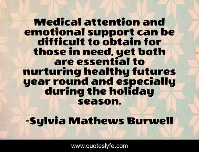 This page presents the quote "Medical attention and emotional support can be difficult to obtain for those in need, yet both are essential to nurturing healthy futures year round and especially during the holiday season.". Author of this quote is Sylvia Mathews Burwell. This quote is about healthy, support, holiday,.