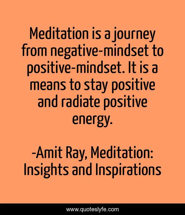 This page presents the quote "Meditation is a journey from negative-mindset to positive-mindset. It is a means to stay positive and radiate positive energy.". Author of this quote is Amit Ray, Meditation: Insights and Inspirations. This quote is about radiate-positive-energy, positive-thoughts, meditation, positive-mindset, positive-thinking,.