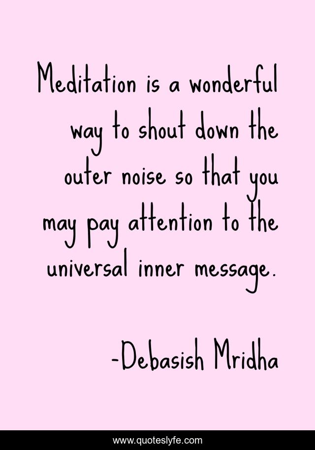 This page presents the quote "Meditation is a wonderful way to shout down the outer noise so that you may pay attention to the universal inner message.". Author of this quote is Debasish Mridha. This quote is about miraboli, oscar-wilde, philosophy, debasish-mridha, quotes, debasish-mridha-md, inspirational, enthusiasm, meditation,.