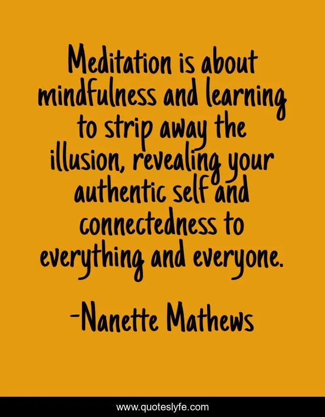 This page presents the quote "Meditation is about mindfulness and learning to strip away the illusion, revealing your authentic self and connectedness to everything and everyone.". Author of this quote is Nanette Mathews. This quote is about mindfulness, awareness, oneness, connectedness, inspirational, authenticity, enthusiasm, meditation, illusion,.