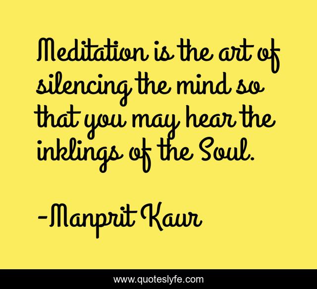 This page presents the quote "Meditation is the art of silencing the mind so that you may hear the inklings of the Soul.". Author of this quote is Manprit Kaur. This quote is about religion, peace, mind, soul, spirituality, mindfulness, meditation, silence, listen,.