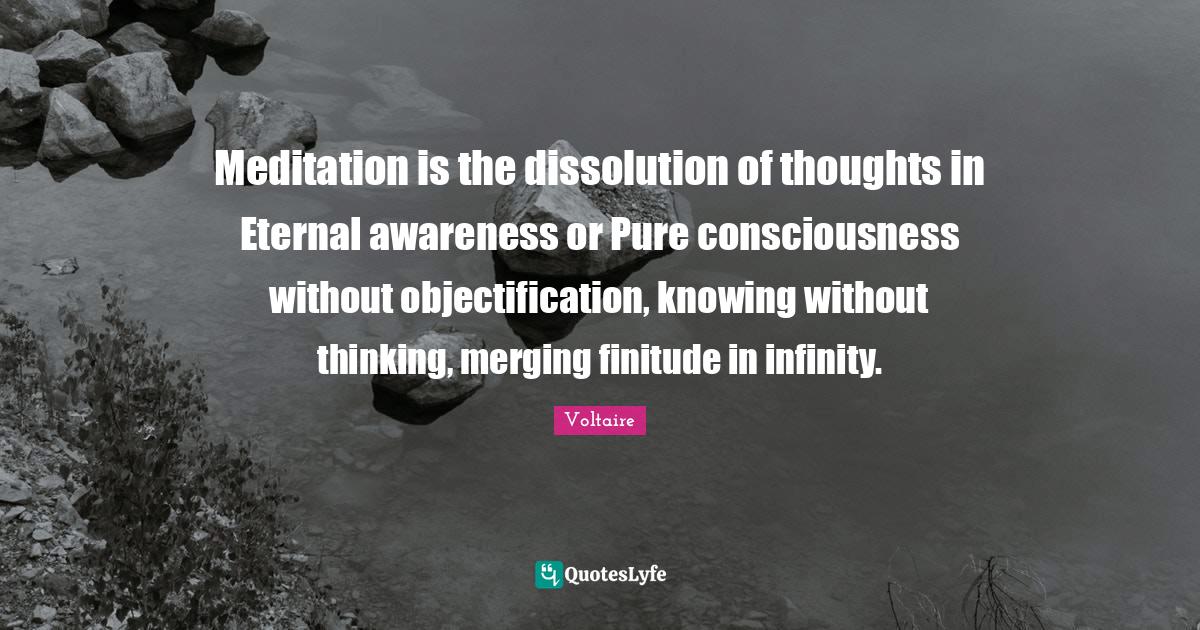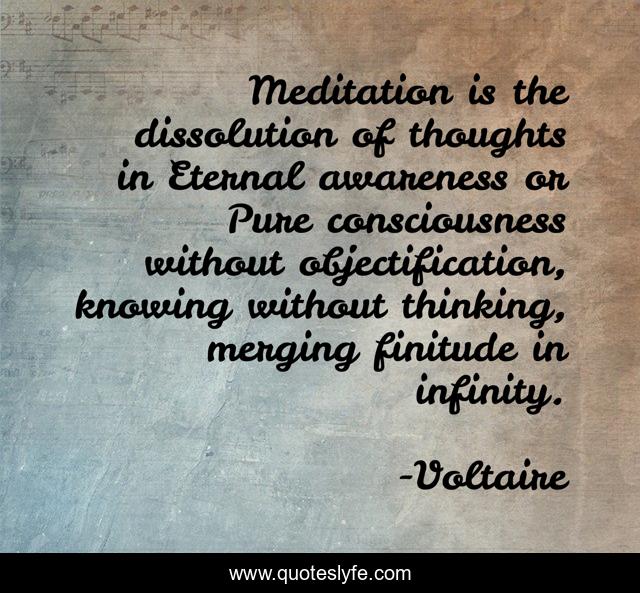 This page presents the quote "Meditation is the dissolution of thoughts in Eternal awareness or Pure consciousness without objectification, knowing without thinking, merging finitude in infinity.". Author of this quote is Voltaire. This quote is about infinity, knowledge, consciousness, thought, meditation, finite, awareness,.