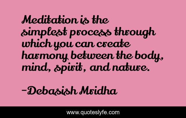 This page presents the quote "Meditation is the simplest process through which you can create harmony between the body, mind, spirit, and nature.". Author of this quote is Debasish Mridha. This quote is about harmony-between-mind-and-body, benefit-of-meditation, philosophy, debasish-mridha, quotes, debasish-mridha-md, inspirational, enthusiasm, meditation,.