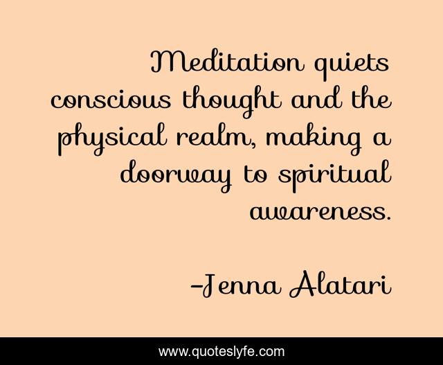 This page presents the quote "Meditation quiets conscious thought and the physical realm, making a doorway to spiritual awareness.". Author of this quote is Jenna Alatari. This quote is about spiritual-awareness, meditation, spiritual,.