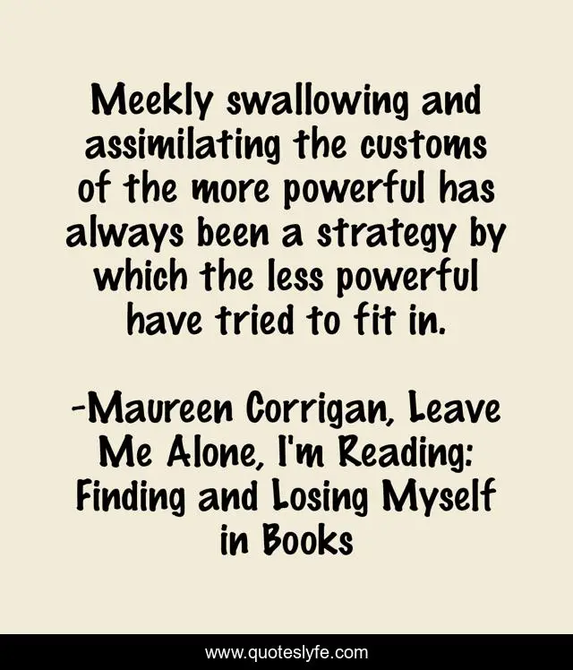 "Maureen Corrigan, Leave Me Alone, I'm Reading: Finding and Losing Myself in Books Quotes." Quoteslyfe.com, 2025. Fri. 05 Dec. 2025. <https://www.quoteslyfe.com/quote/Meekly-swallowing-and-assimilating-the-customs-of-161081>.