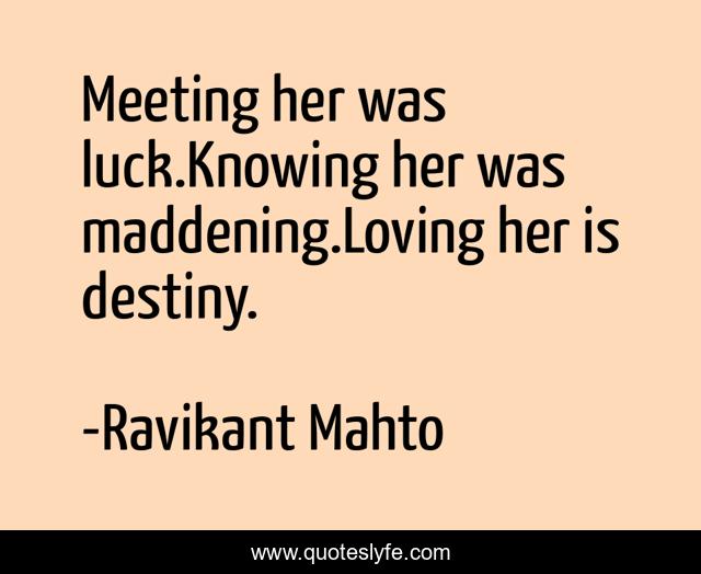 This page presents the quote "Meeting her was luck.Knowing her was maddening.Loving her is destiny.". Author of this quote is Ravikant Mahto. This quote is about love, maddening, destiny, affection,.