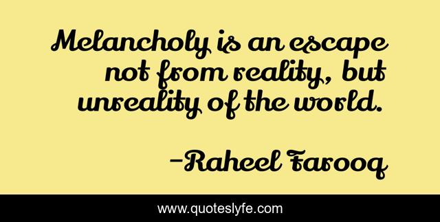 This page presents the quote "Melancholy is an escape not from reality, but unreality of the world.". Author of this quote is Raheel Farooq. This quote is about melancholy, madness, rationality, reality,.