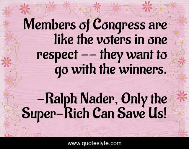 This page presents the quote "Members of Congress are like the voters in one respect -- they want to go with the winners.". Author of this quote is Ralph Nader, Only the Super-Rich Can Save Us!. This quote is about money, leaders, congress,.
