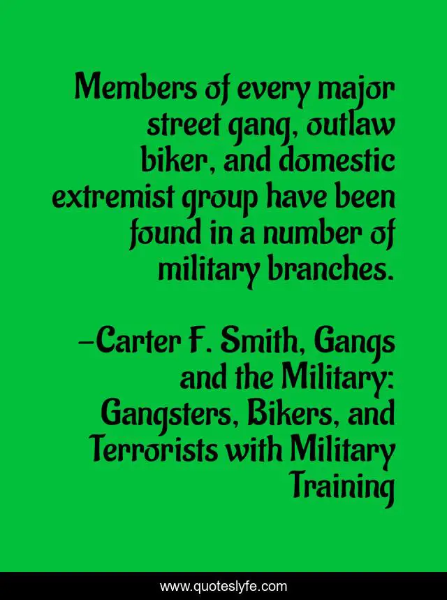 This page presents the quote "Members of every major street gang, outlaw biker, and domestic extremist group have been found in a number of military branches.". Author of this quote is Carter F. Smith, Gangs and the Military: Gangsters, Bikers, and Terrorists with Military Training. This quote is about biker-gang, marine-corps, army, air-force, domestic-terrorism, gangster, street-gangs, military-history, navy,.