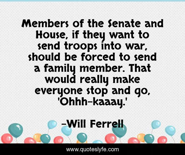 This page presents the quote "Members of the Senate and House, if they want to send troops into war, should be forced to send a family member. That would really make everyone stop and go, 'Ohhh-kaaay.'". Author of this quote is Will Ferrell. This quote is about house, family,.