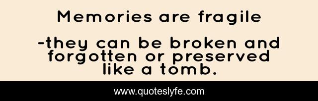 This page presents the quote "Memories are fragile". Author of this quote is they can be broken and forgotten or preserved like a tomb.. .