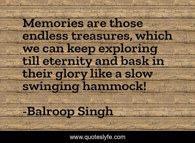 This page presents the quote "Memories are those endless treasures, which we can keep exploring till eternity and bask in their glory like a slow swinging hammock!". Author of this quote is Balroop Singh. This quote is about memories, treasures,.