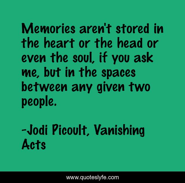 This page presents the quote "Memories aren't stored in the heart or the head or even the soul, if you ask me, but in the spaces between any given two people.". Author of this quote is Jodi Picoult, Vanishing Acts. This quote is about heart, head, memory, soul, space,.