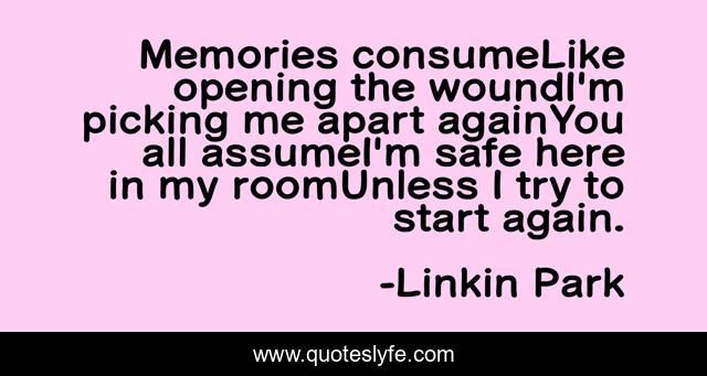 This page presents the quote "Memories consumeLike opening the woundI'm picking me apart againYou all assumeI'm safe here in my roomUnless I try to start again.". Author of this quote is Linkin Park. This quote is about linkin-park, addiction, song-lyrics,.