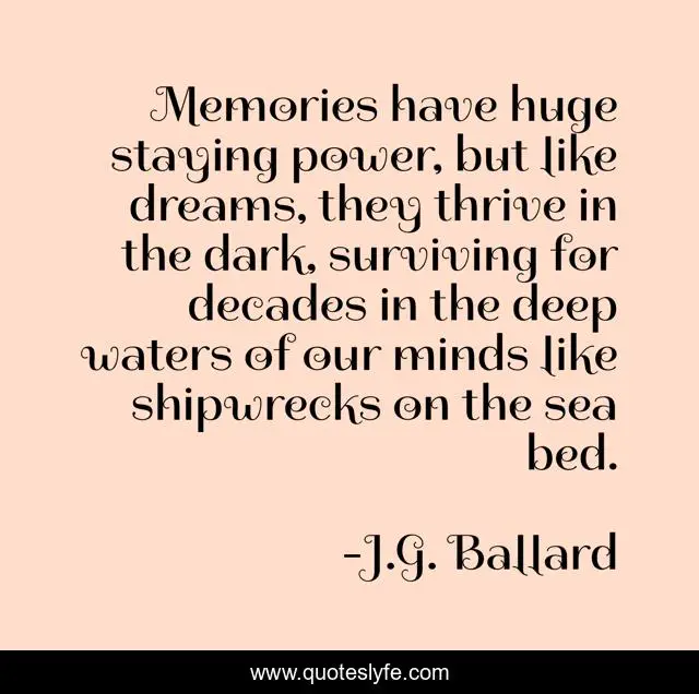 This page presents the quote "Memories have huge staying power, but like dreams, they thrive in the dark, surviving for decades in the deep waters of our minds like shipwrecks on the sea bed.". Author of this quote is J.G. Ballard. This quote is about memories, shipwrecks-minds, dreams,.