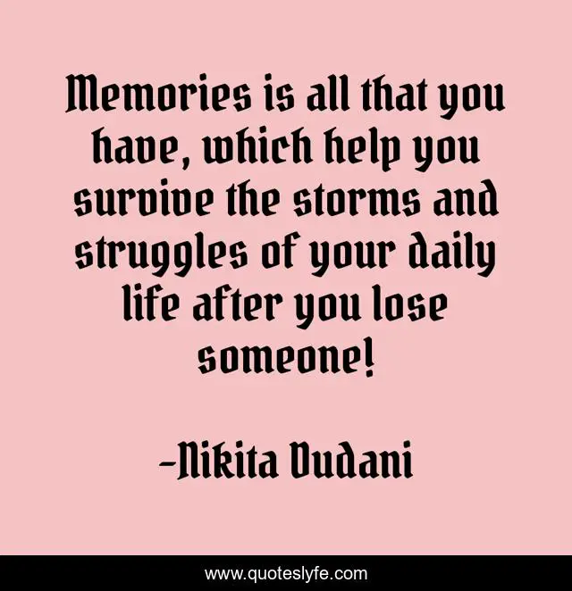 This page presents the quote "Memories is all that you have, which help you survive the storms and struggles of your daily life after you lose someone!". Author of this quote is Nikita Dudani. This quote is about loss-of-family, loss, memories, loss-of-love, death-of-a-loved-one, death-and-love, memories-with-mom,.
