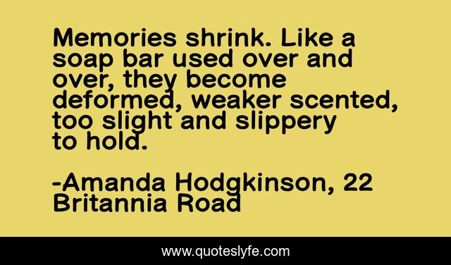 This page presents the quote "Memories shrink. Like a soap bar used over and over, they become deformed, weaker scented, too slight and slippery to hold.". Author of this quote is Amanda Hodgkinson, 22 Britannia Road. .
