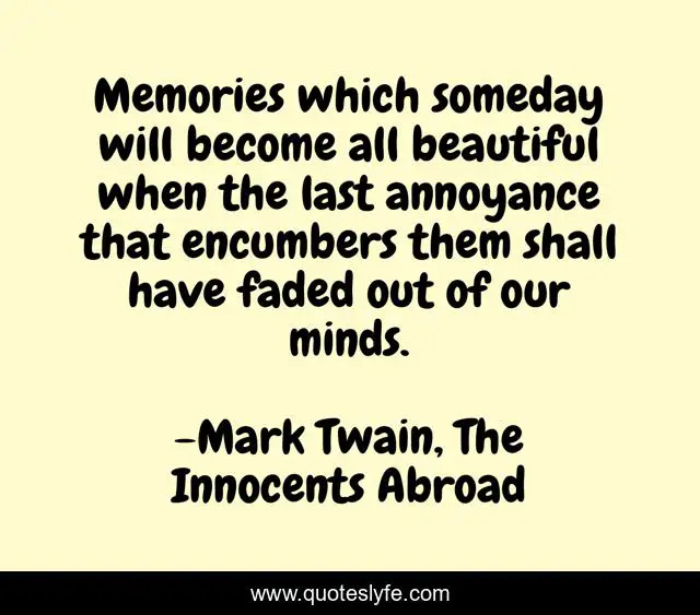 This page presents the quote "Memories which someday will become all beautiful when the last annoyance that encumbers them shall have faded out of our minds.". Author of this quote is Mark Twain, The Innocents Abroad. This quote is about life, memory,.