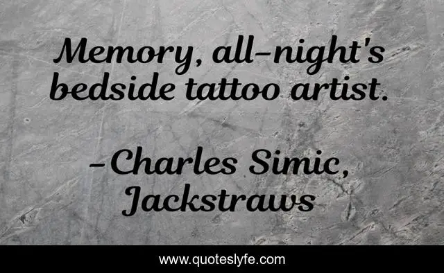 "Charles Simic, Jackstraws Quotes." Quoteslyfe.com, 2025. Sun. 07 Dec. 2025. <https://www.quoteslyfe.com/quote/Memory-all-night-s-bedside-tattoo-artist-133102>.