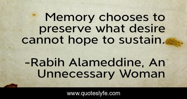 This page presents the quote "Memory chooses to preserve what desire cannot hope to sustain.". Author of this quote is Rabih Alameddine, An Unnecessary Woman. This quote is about desire, love, affection, memory,.
