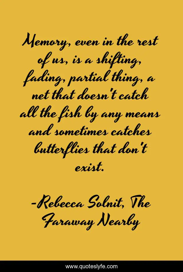 This page presents the quote "Memory, even in the rest of us, is a shifting, fading, partial thing, a net that doesn't catch all the fish by any means and sometimes catches butterflies that don't exist.". Author of this quote is Rebecca Solnit, The Faraway Nearby. .