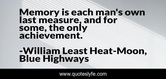 This page presents the quote "Memory is each man's own last measure, and for some, the only achievement.". Author of this quote is William Least Heat-Moon, Blue Highways. This quote is about travel, memoir,.