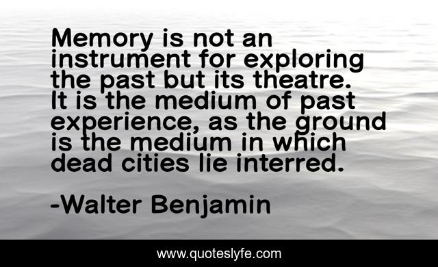 This page presents the quote "Memory is not an instrument for exploring the past but its theatre. It is the medium of past experience, as the ground is the medium in which dead cities lie interred.". Author of this quote is Walter Benjamin. This quote is about memory, experience, time,.