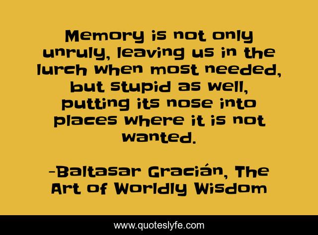This page presents the quote "Memory is not only unruly, leaving us in the lurch when most needed, but stupid as well, putting its nose into places where it is not wanted.". Author of this quote is Baltasar Gracián, The Art of Worldly Wisdom. .