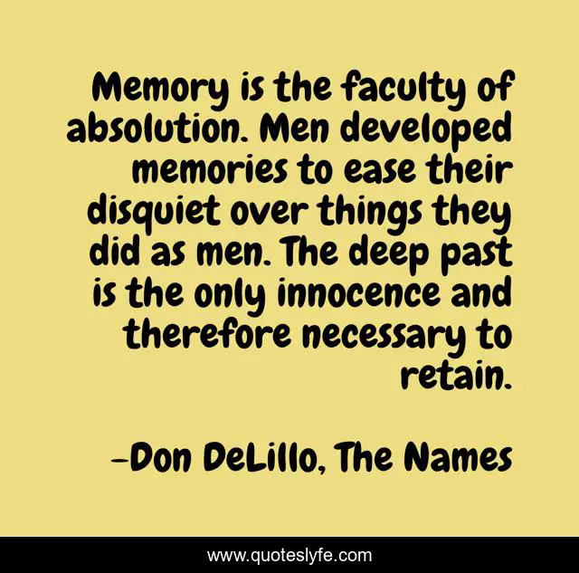 This page presents the quote "Memory is the faculty of absolution. Men developed memories to ease their disquiet over things they did as men. The deep past is the only innocence and therefore necessary to retain.". Author of this quote is Don DeLillo, The Names. .