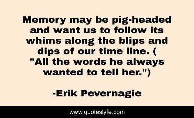 This page presents the quote "Memory may be pig-headed and want us to follow its whims along the blips and dips of our time line. ( "All the words he always wanted to tell her.")". Author of this quote is Erik Pevernagie. This quote is about memory, blips-and-dips, pig-headed, whims, timeline,.