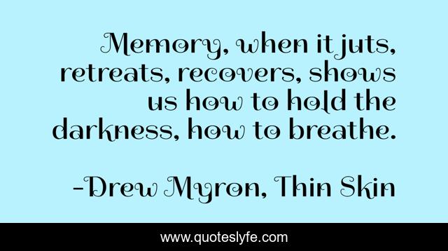 This page presents the quote "Memory, when it juts, retreats, recovers, shows us how to hold the darkness, how to breathe.". Author of this quote is Drew Myron, Thin Skin. This quote is about breathe, poem, darkness-and-light, recovery-from-grief, poetry, memory, resilience,.