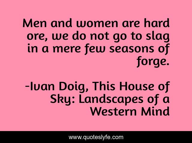 This page presents the quote "Men and women are hard ore, we do not go to slag in a mere few seasons of forge.". Author of this quote is Ivan Doig, This House of Sky: Landscapes of a Western Mind. .