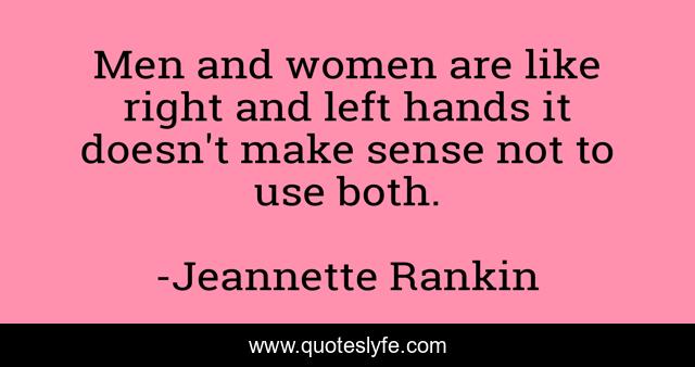 This page presents the quote "Men and women are like right and left hands it doesn't make sense not to use both.". Author of this quote is Jeannette Rankin. This quote is about men and women, men, hands,.