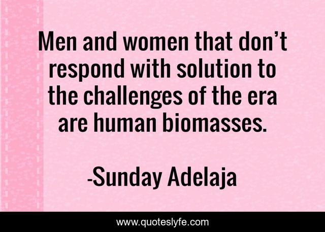 This page presents the quote "Men and women that don’t respond with solution to the challenges of the era are human biomasses.". Author of this quote is Sunday Adelaja. This quote is about respond, challenge, era, solution,.