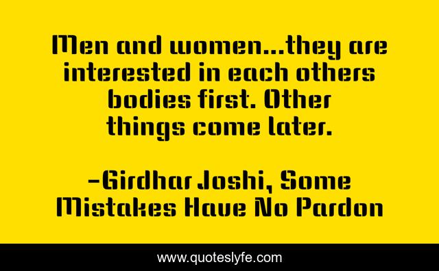 This page presents the quote "Men and women…they are interested in each others bodies first. Other things come later.". Author of this quote is Girdhar Joshi, Some Mistakes Have No Pardon. This quote is about men, bodies, women,.
