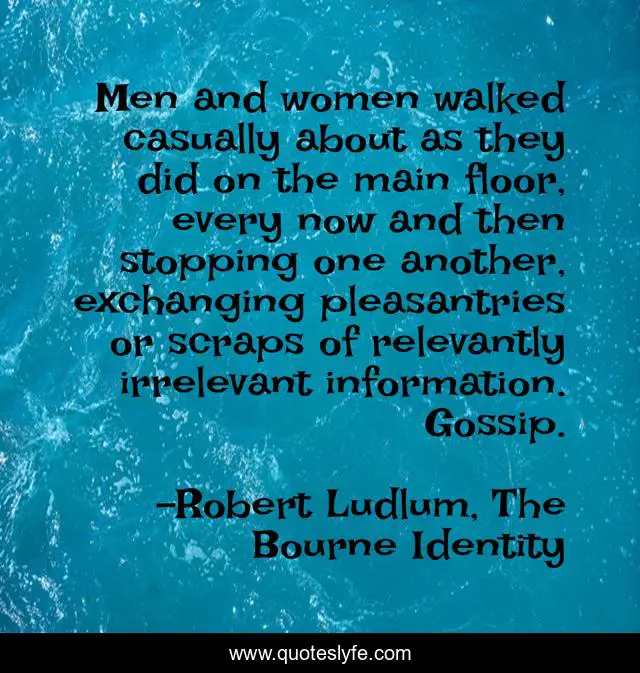 This page presents the quote "Men and women walked casually about as they did on the main floor, every now and then stopping one another, exchanging pleasantries or scraps of relevantly irrelevant information. Gossip.". Author of this quote is Robert Ludlum, The Bourne Identity. .