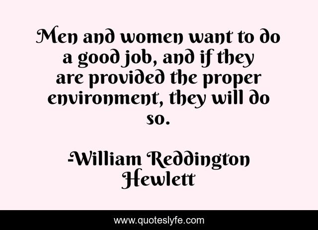 This page presents the quote "Men and women want to do a good job, and if they are provided the proper environment, they will do so.". Author of this quote is William Reddington Hewlett. This quote is about job, good, men,.