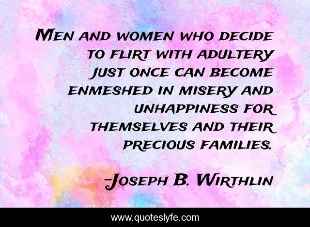 This page presents the quote "Men and women who decide to flirt with adultery just once can become enmeshed in misery and unhappiness for themselves and their precious families.". Author of this quote is Joseph B. Wirthlin. This quote is about men and women, precious, men,.