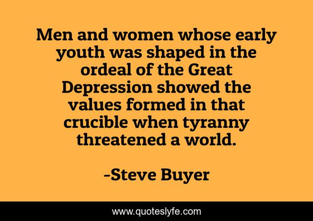 This page presents the quote "Men and women whose early youth was shaped in the ordeal of the Great Depression showed the values formed in that crucible when tyranny threatened a world.". Author of this quote is Steve Buyer. This quote is about world, great, depression,.