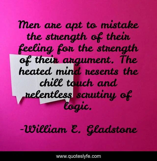 This page presents the quote "Men are apt to mistake the strength of their feeling for the strength of their argument. The heated mind resents the chill touch and relentless scrutiny of logic.". Author of this quote is William E. Gladstone. This quote is about men, mind, mistake,.