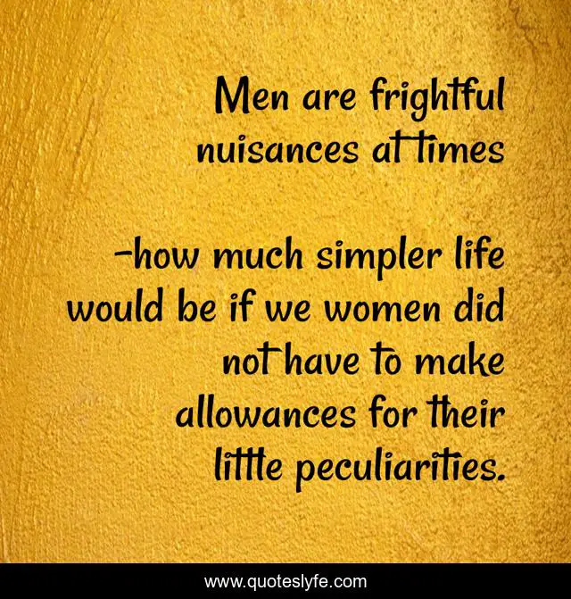 "how much simpler life would be if we women did not have to make allowances for their little peculiarities. Quotes." Quoteslyfe.com, 2025. Mon. 08 Dec. 2025. <https://www.quoteslyfe.com/quote/Men-are-frightful-nuisances-at-times-127617>.