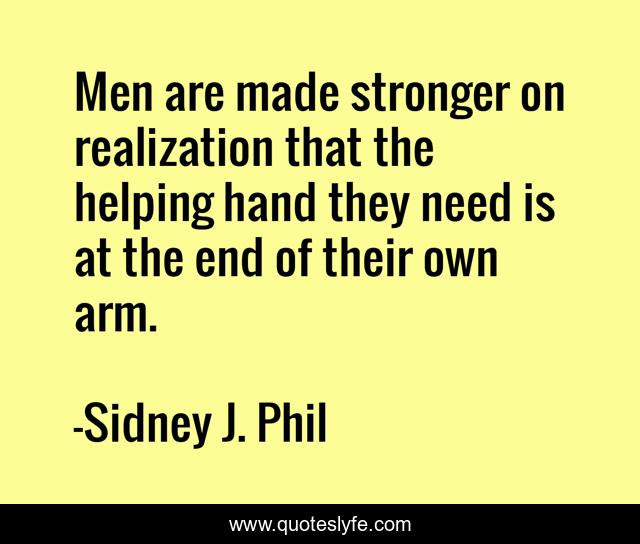 This page presents the quote "Men are made stronger on realization that the helping hand they need is at the end of their own arm.". Author of this quote is Sidney J. Phil. This quote is about self, reliance,.