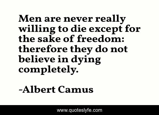 This page presents the quote "Men are never really willing to die except for the sake of freedom: therefore they do not believe in dying completely.". Author of this quote is Albert Camus. This quote is about die, believe, men,.
