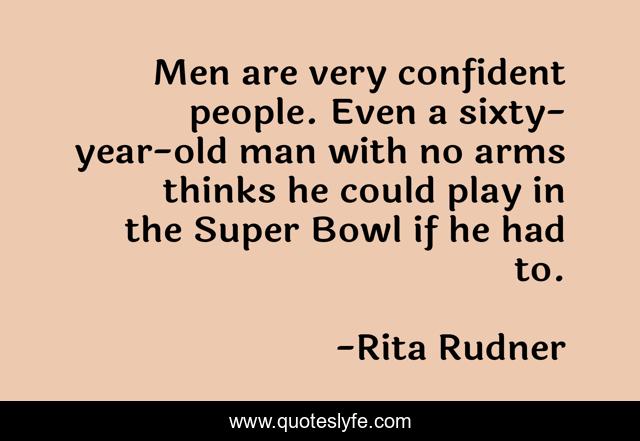 This page presents the quote "Men are very confident people. Even a sixty-year-old man with no arms thinks he could play in the Super Bowl if he had to.". Author of this quote is Rita Rudner. .