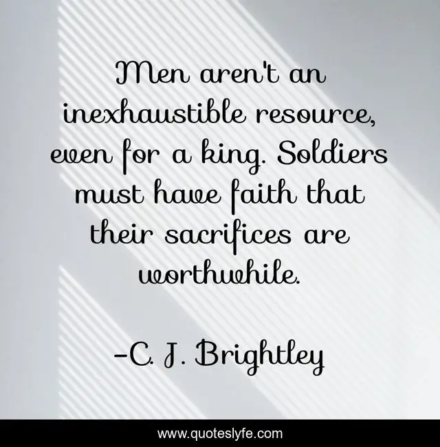 This page presents the quote "Men aren't an inexhaustible resource, even for a king. Soldiers must have faith that their sacrifices are worthwhile.". Author of this quote is C. J. Brightley. .